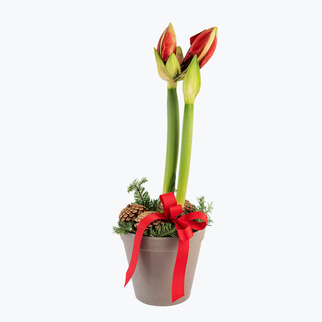 Rød amaryllis pyntet til julefest i en pen diskret potte. Å følge utviklingen fra knopp til en Amaryllis som står i fullt flor kan oppleves som rene julemagien! Potten er miljøvennlig og produsert av nedbrytbare gjenbruksmaterialer. En holdbar, lettstelt hilsen som er spesielt fin å sende i adventstida.